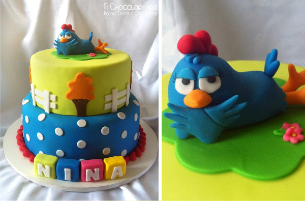 Foi o primeiro bolo de Galinha Pintadinha que eu fiz, logo em janeiro do ano passado. Fofo toda vida, colorido, e com a Galinha toda faceira lançando aquele olhar 43.. Por dentro, massa branca, doce de leite e brigadeiro.